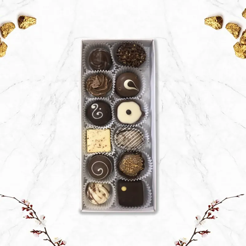 *12 ръчно изработени бонбона – изкусно създадени, за да впечатляват с вкус и визия.