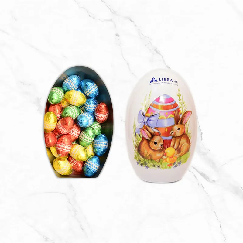 Впечатляващо великденско предложение, което съчетава празнична визия, вкусен шоколад и възможности за персонализиране. Голямото метално яйце с обемна и елегантна форма е подходящо за индивидуален подарък, корпоративен жест или част от празничен комплект, с разнообразни дизайни – класическо бяло яйце с малко зайче, цветно с vintage зайчета или други декоративни елементи. След празника кутията остава функционална и декоративна, подходяща за съхранение на дребни вещи или като акцент в дома, добавяйки дълготрайна стойност към подаръка.