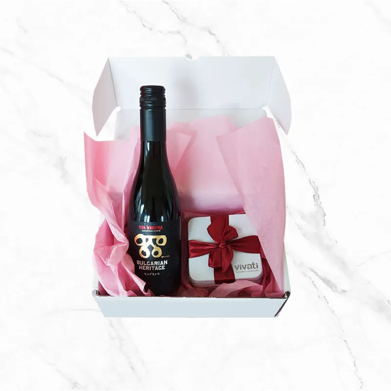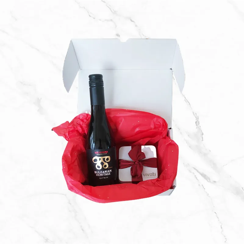 Wine & Red ribbon е компактен и елегантен подаръчен комплект, създаден за дискретно корпоративно поднасяне. Комбинацията от подбрано вино и брандирана бонбониера създава балансирано решение, подходящо за различни поводи и бизнес ситуации.